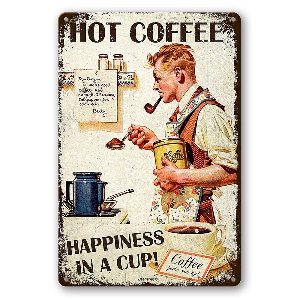 Tin sign hot coffee happiness in a cup! man cave.