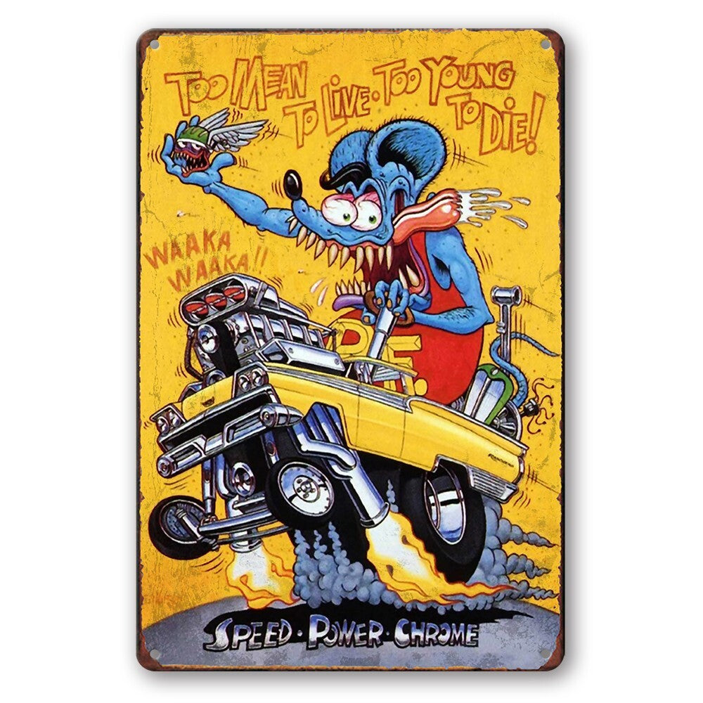Tin Sign Rat Fink Too Yong Mean Speed Power Chrome Rustic Look Decorative