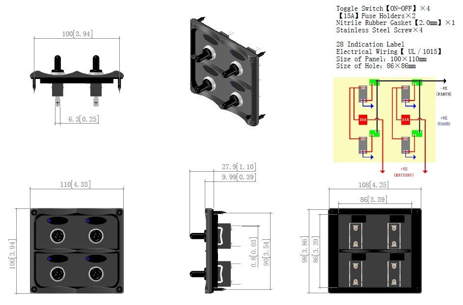Toggle Switch Panel 4 Gang 15a Marine Boat Caravan Water Pro Blade Fuse